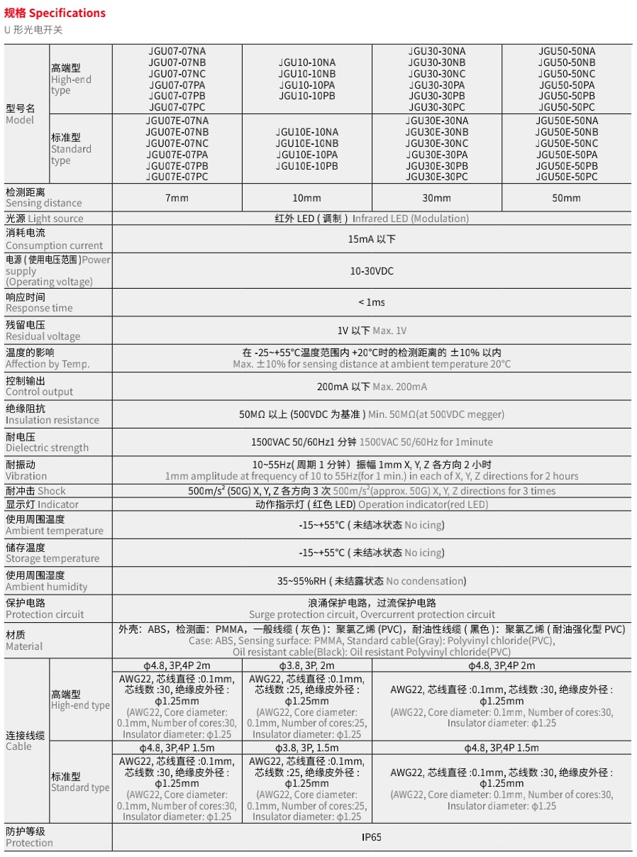 用专用 IC 提高抗干扰能力 内置浪涌保护,电源反接保护电路 寿命长,高可靠性,操作简单,经济实惠 红色 LED 状态指示灯,易于识别运行状态 IP65 防护等级 (IEC 规格 )