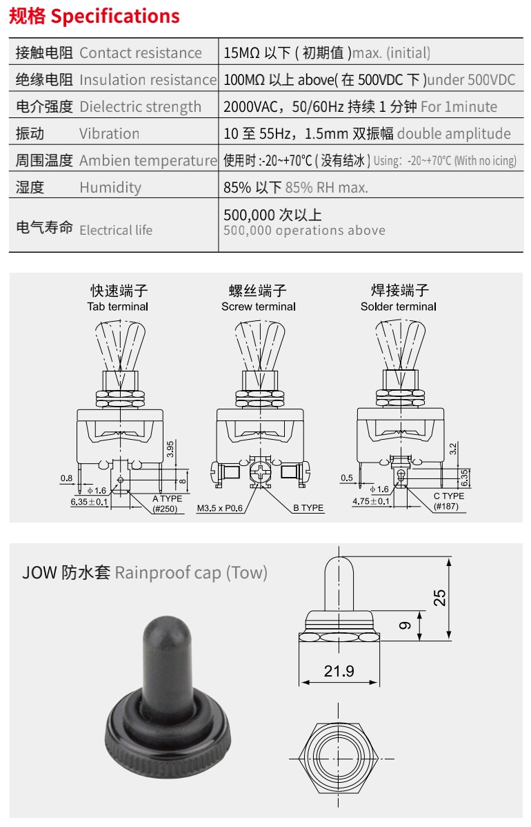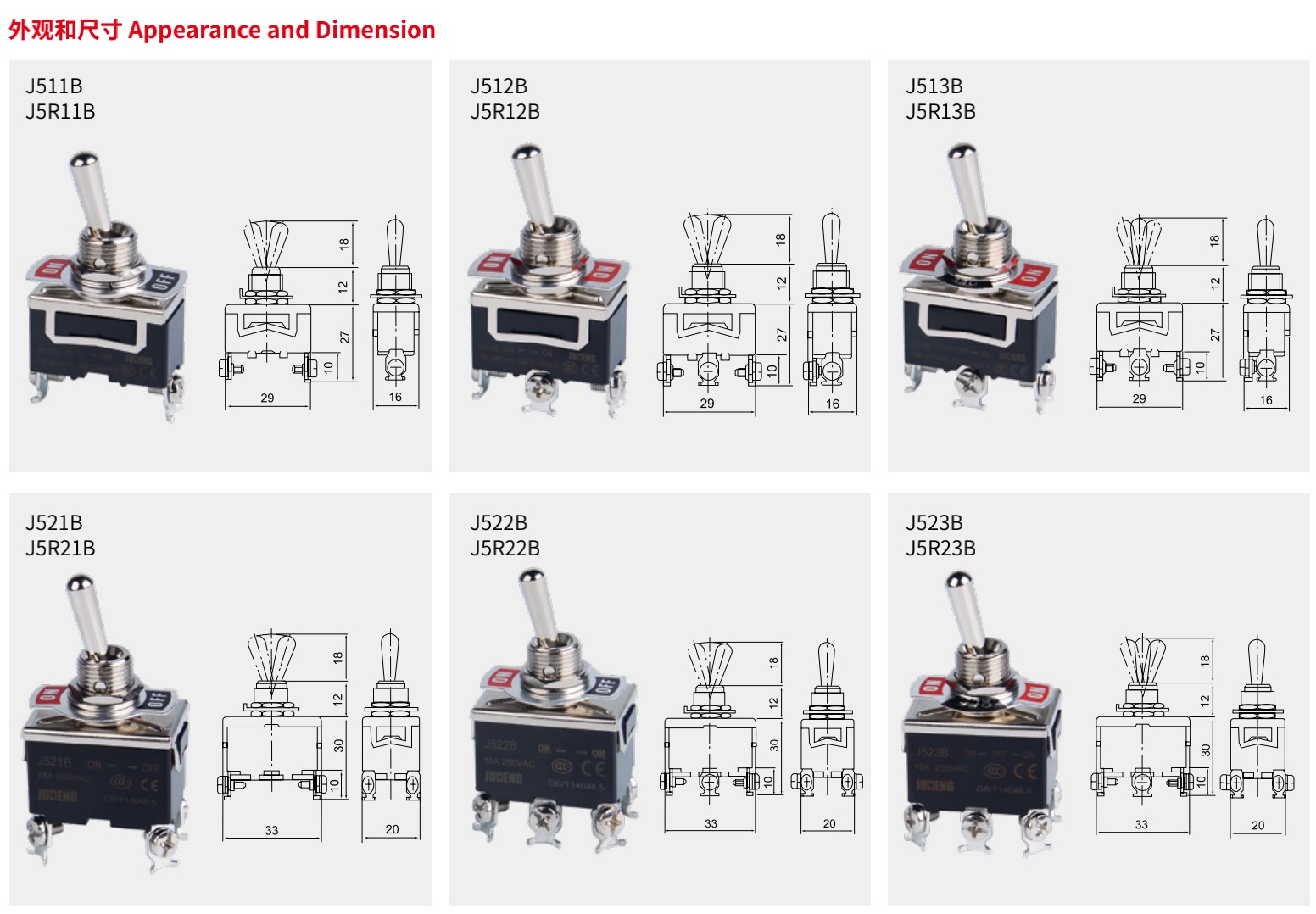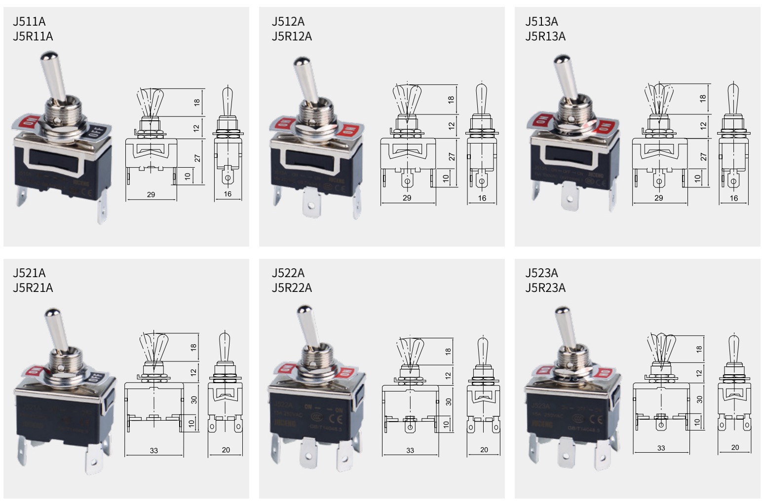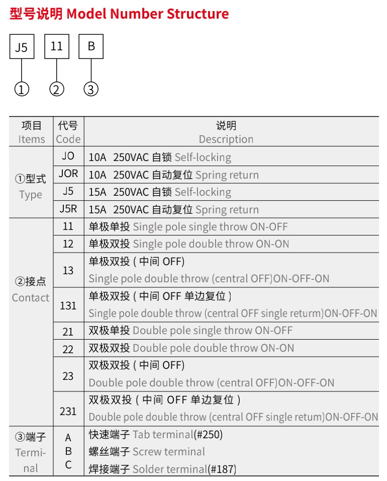 流分 10A 及 15A 切换方式有固定式及复位式 ( 单投及双投皆可复归 ) 接线端子有螺丝端子及焊接端子 ( 亦可用快速端子 ) 防水套可防水、防油,适用于全系列 固定孔径 :φ12mm