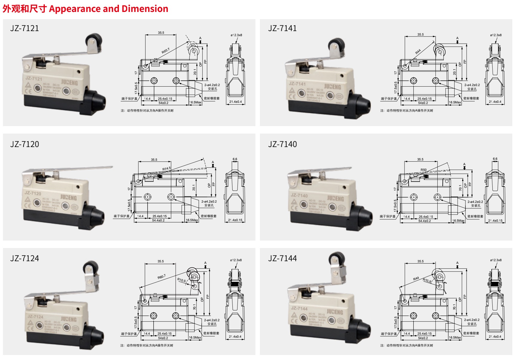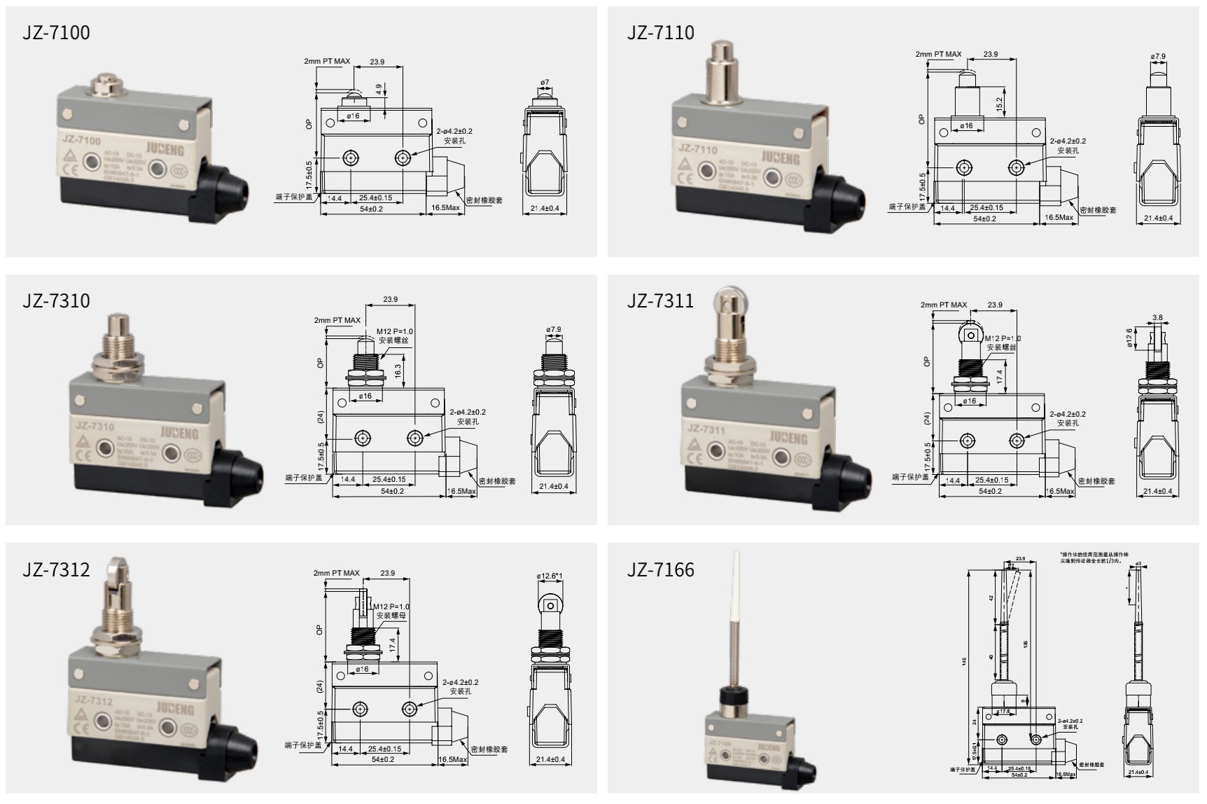 动器种类广泛,其中包含动作位置可调整的款式 ( 如 JZ-7121) 外壳包覆强化塑胶、防水、防油,较 JM 型卧式限位开关有更高的机械强度,耐冲击